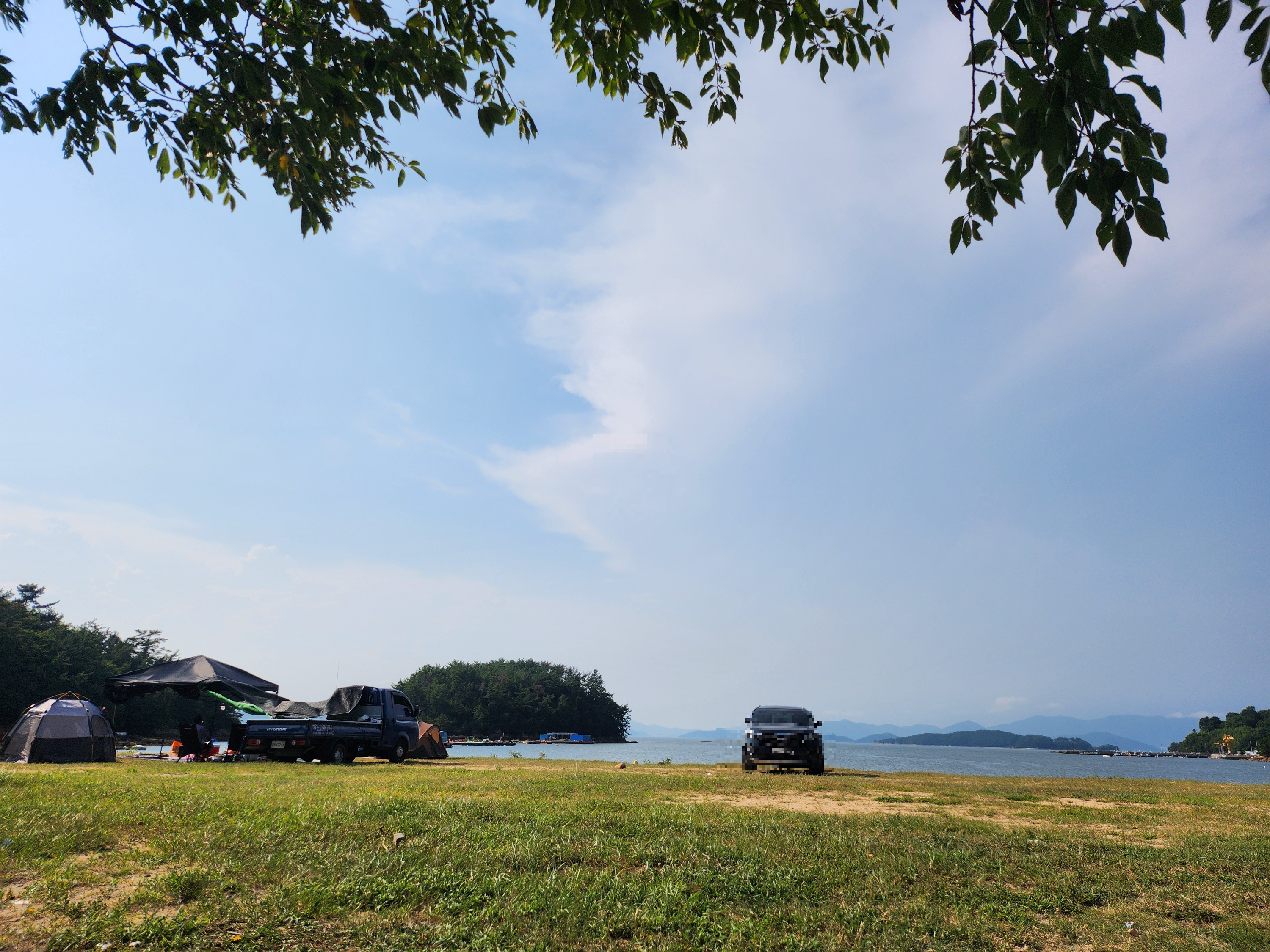 여름 땡볕이 너무 뜨거워서 나무그늘아래 자리를 잡았다. 바다와는 거리가 좀 있지만 타프를 치지 않아도 되는 나무그늘은 최고다.
